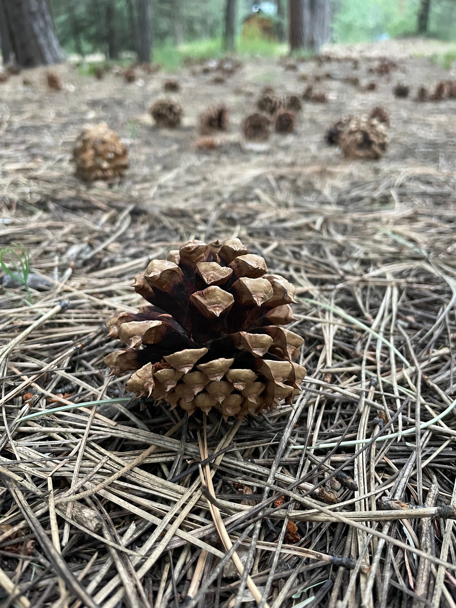 Seeds that, of course, didn’t start out buried in the ground. They were once on the ground, as…pinecones. There would have been a pinecone everywhere a tree is now (how had I never thought of that?). Dropped by some other tree, that probably isn’t even here anymore, maybe while some other camper was minding their own business years ago when they heard something go…plop.